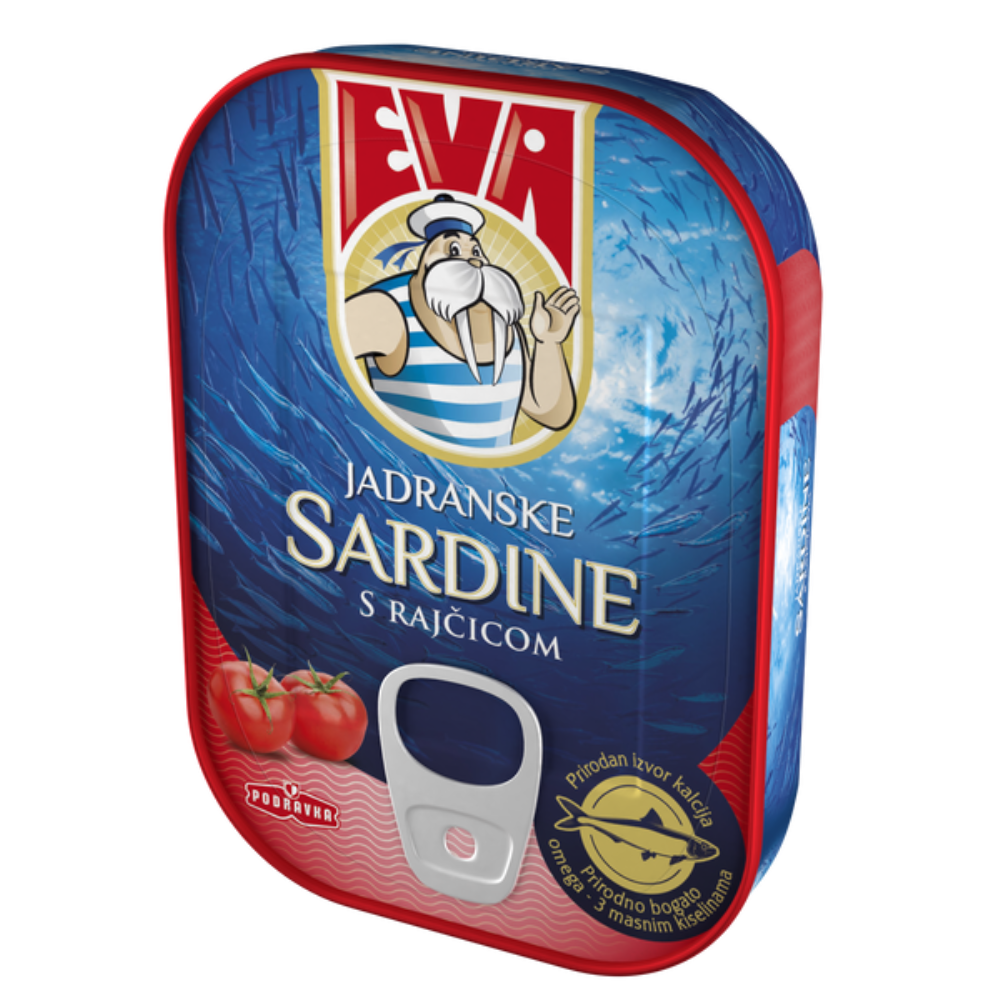 srdela (Sardina pilchardus) min. 65%, umak max. 35% (voda, koncentrat rajčice 20%, sojino ulje, šećer, kuhinjska sol, ocat, pšenično brašno). Energetska vrijednost 116 kcal / 488 kJ Masti = 4.6 g - zasićene masne kiseline = 1.3 g Ugljikohidrati = 2.7 g - šećeri = 1.6 g Bjelančevine = 16 g Sol = 0.74 g Kalcij = 302 mg