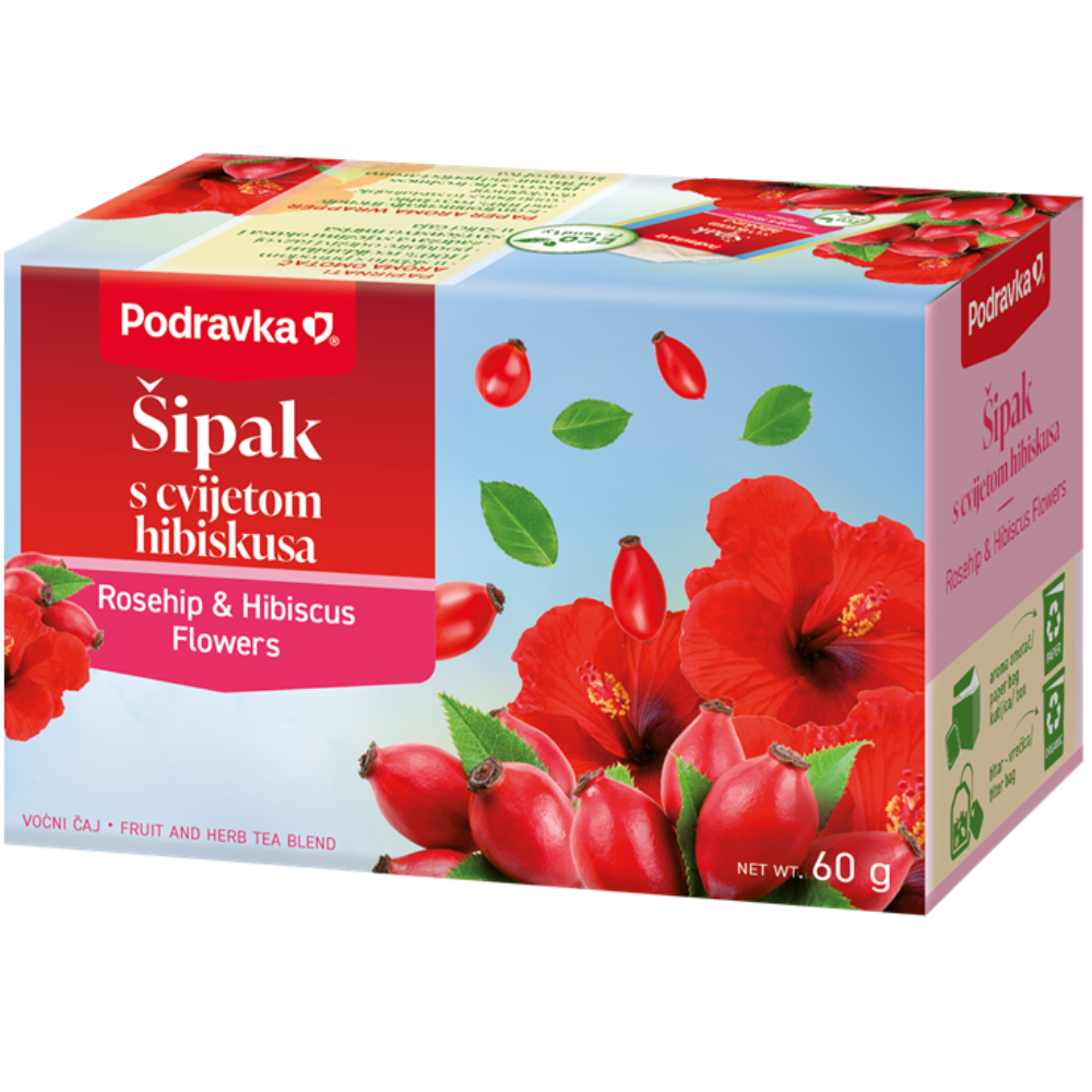 plod šipka 75%, cvijet hibiskusa 25%; Masti = 0.6 g,Ugljikohidrati = 76.6 g,- šećeri = 23.6 g,Bjelančevine = 5.1 g,Vitamin C = 96.5 mg,Kalij = 1065 mg,Kalcij = 655 mg,Fosfor = 140 mg,Magnezij = 185 mg,Željezo = 0.8 mg,Cink = 1.2 mg,Bakar = 0.3 mg
