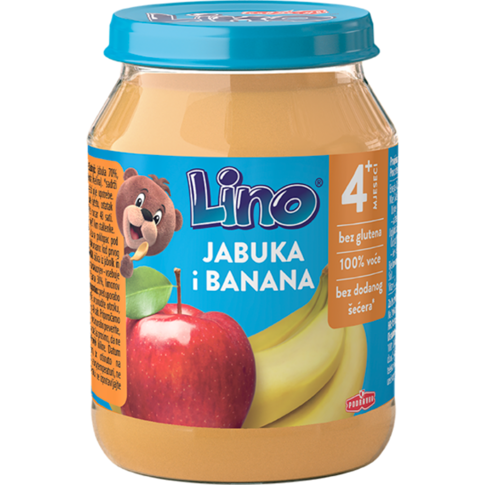 jabuka 70%, banana 30%, koncentrat limuna, vitamin C (L-askorbinska kiselina); Masti = 0.5 g,- zasićene masne kiseline = 0.1 g,Ugljikohidrati = 14 g,- šećeri = 11 g,Bjelančevine = 0.5 g,Sol = 0 g,Vitamin C = 10 mg
