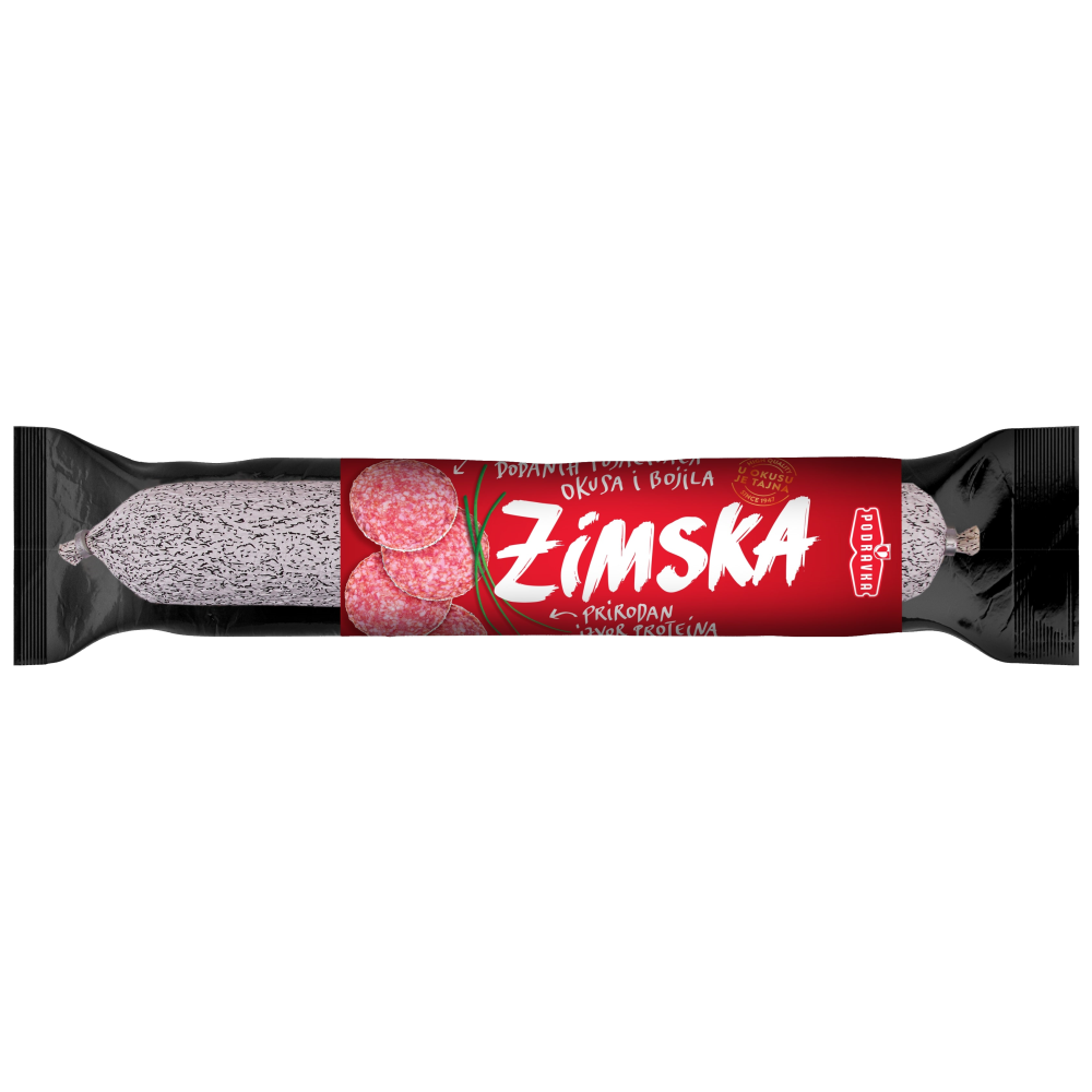 svinjsko meso, kuhinjska sol, začini, ekstrakti začina, šećer, dekstroza, antioksidansi: natrijev izoaskorbat, limunska kiselina; konzervans natrijev nitrit, aroma, starter kultura. Može sadržavati soju, gorušicu i pistaciju. 100 g proizvoda je proizvedeno od 148 g mesa; Masti = 42 g,- zasićene masne kiseline = 16 g,Ugljikohidrati = 3.3 g,- šećeri = 0.4 g,Bjelančevine = 22 g,Sol = 3 g