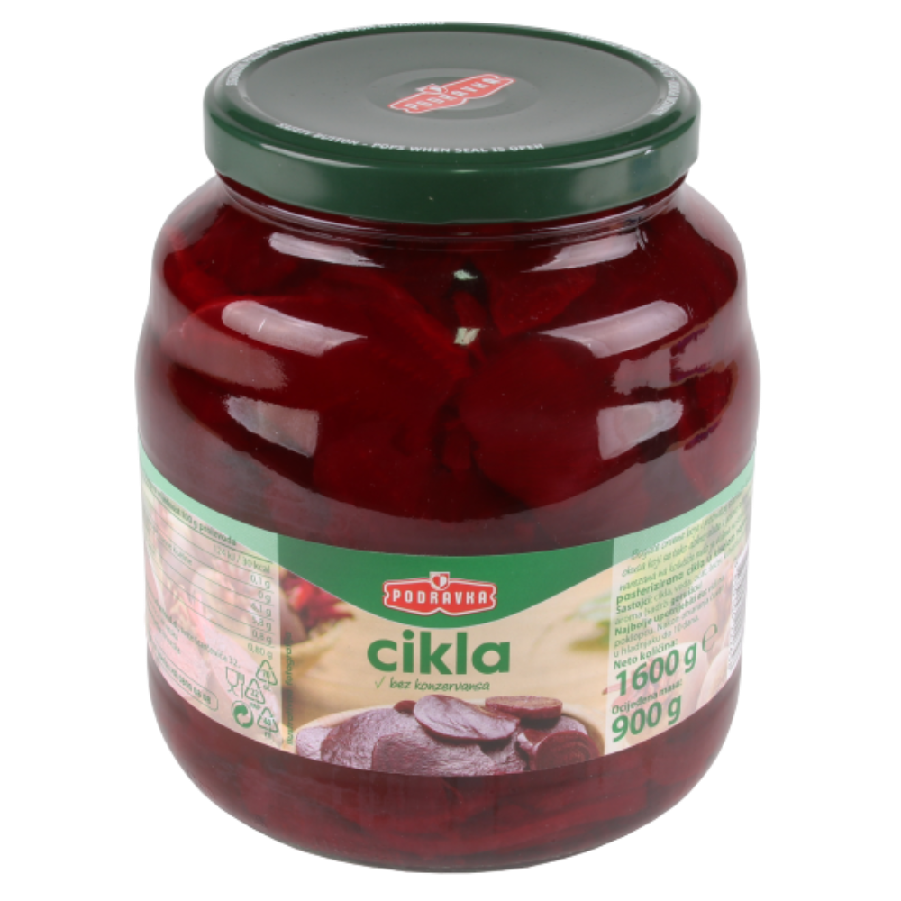 cikla, voda, ocat, šećer, kuhinjska sol i prirodna aroma (sadrži gorušicu); Masti = 0.1 g,- zasićene masne kiseline = 0 g,Ugljikohidrati = 6.1 g,- šećeri = 5.8 g,Bjelančevine = 0.8 g,Sol = 0.8 g,Vitamin B12 = 0 μg,Kalij = 124 mg,Magnezij = 18.4 mg,Željezo = 0.38 mg,Bakar = 0.07 mg